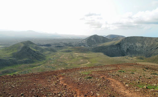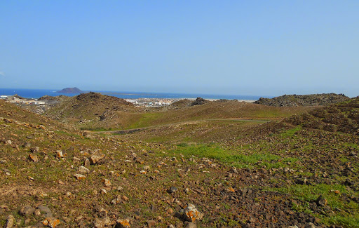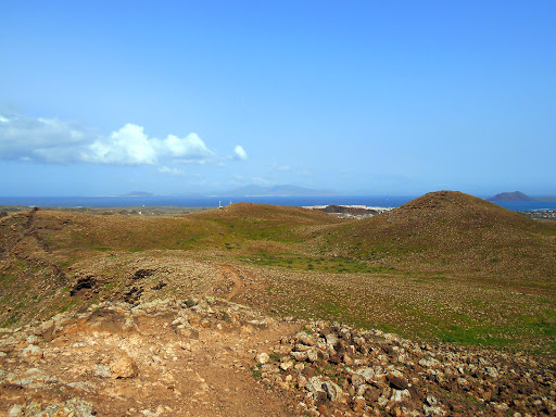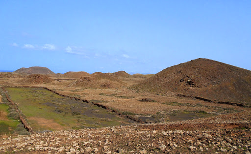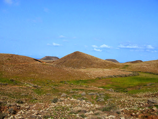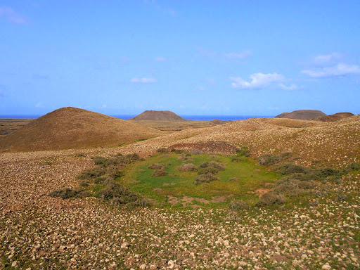 Zaczynam się czuc,jak w krainie hobbitów; małe kopuły i zieleniaca się między wulkanicznymi kamieniami trawa; jakaś dziwna dziura . te małe górki to hornitos – miniwulkany;powstałe w wyniku erupcji dużych ilosci lawy. Jestem w szoku – wszystkiego się spodziewałam na Fuerteventurze, ale nie zieleni i sielankowych krajobrazów. Zieleń w ostrym słońcu bije po oczach, aparat rozgrzany do czerwoności, a ja z tym głupim uśmiechem na twarzy,który pojawia się,kiedy na szlaku widzę coś, czego się kompletnie nie spodziewałam. Kiedy myślisz : „ale tu jest zajebiście!”