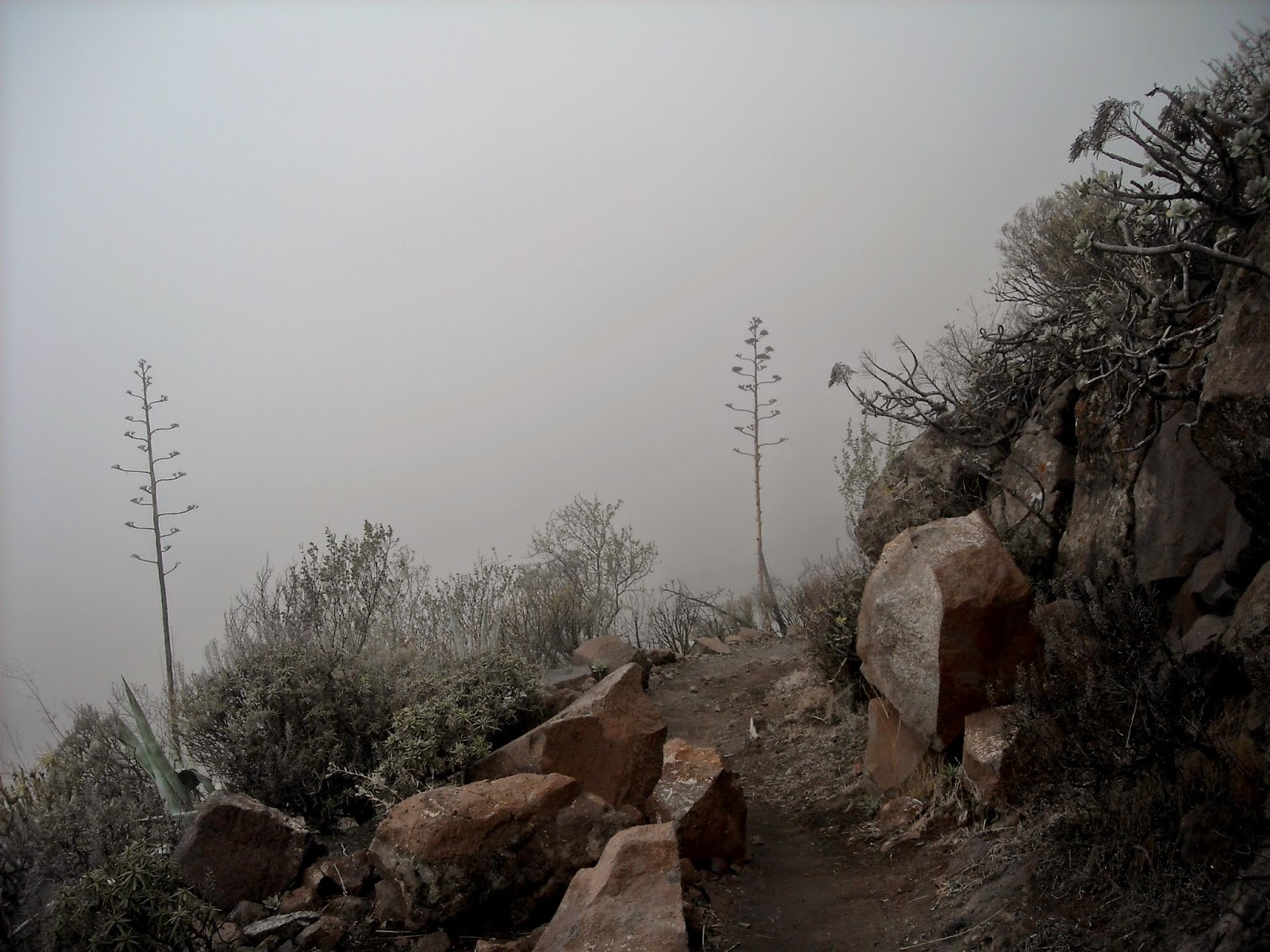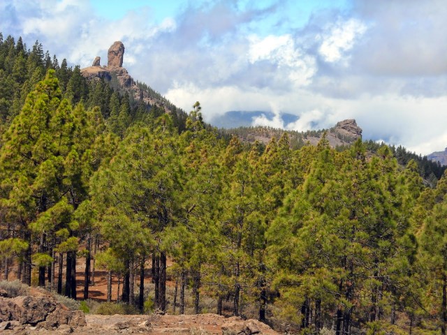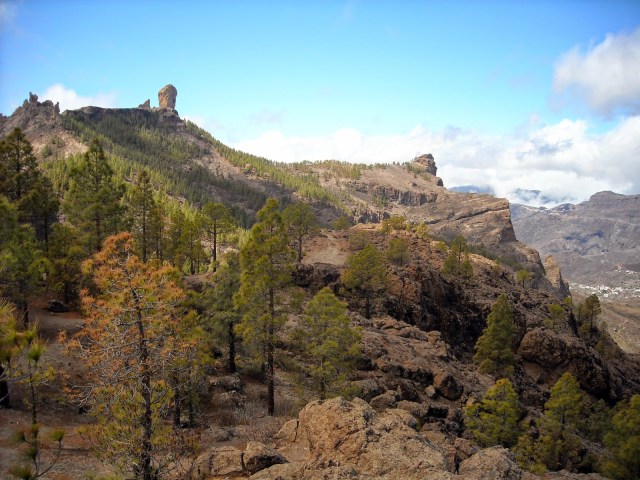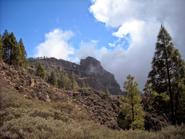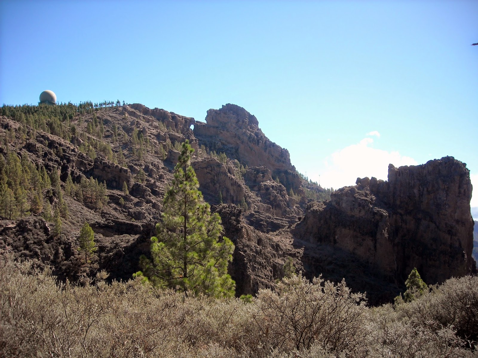 Po jakimś czasie dochodzę do rozdroża szlaków, na Pozo de Las Nieves trzeba odbić w prawo i w górę, szlak nadal trawersuje łagodnie zalesione zbocza. Po lewej zaczynają się pojawiać odległe formacje skalne ( min Roque Nublo).Po zejściu z głównego szlaku kończą się jakiekolwiek oznaczenia, idę po prostu dobrze wydeptaną ścieżką.Idę dość szybkim tempem, bo nie wiem ile jeszcze do szczytu, ile zajmie mi zejście a jedyny autobus do cywilizacji wyjeżdża z wioski Ayacata ok 15 (dokładnie o której – też nie wiem) Cały czas zastanawiam się, gdzie jest ścieżka na Pozo de Las Nieves – zdecydowałam.że odpuszczę sobie najwyższy szczyt,gdzie można dojechać asfaltową drogą i można spodziewać się tłumu. Ścieżki nie ma, wiec idę i idę, aż w końcu widzę jakieś zabudowania i coś co wygląda jak szczyt.