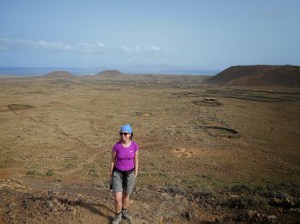 Po 1,5 godziny jestem na równinie z wulkanami po obu stronach szlaku, widać też już wybrzeże i Corralejo,a także góry na horyzoncie, Widoczność średnia,na pewno przez ostre południowe słońce, ale wycieczka wciąż przyjemna. Na tym etapie szlaku warto zboczyć i wspiąć się na wulkan Hondo – kamienny chodnik prowadzi na skraj krateru. Tam zrobiłam sobie pamiątkową fotkę i przerwę na drugie śniadanie.
