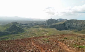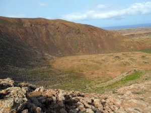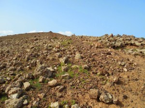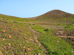 Zaczynam się czuc,jak w krainie hobbitów; małe kopuły i zieleniaca się między wulkanicznymi kamieniami trawa; jakaś dziwna dziura . te małe górki to hornitos – miniwulkany;powstałe w wyniku erupcji dużych ilosci lawy. Jestem w szoku – wszystkiego się spodziewałam na Fuerteventurze, ale nie zieleni i sielankowych krajobrazów. Zieleń w ostrym słońcu bije po oczach, aparat rozgrzany do czerwoności, a ja z tym głupim uśmiechem na twarzy,który pojawia się,kiedy na szlaku widzę coś, czego się kompletnie nie spodziewałam. Kiedy myślisz : „ale tu jest zajebiście!”
