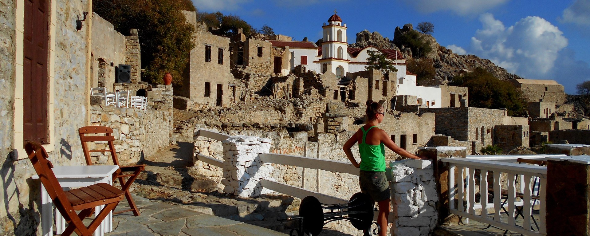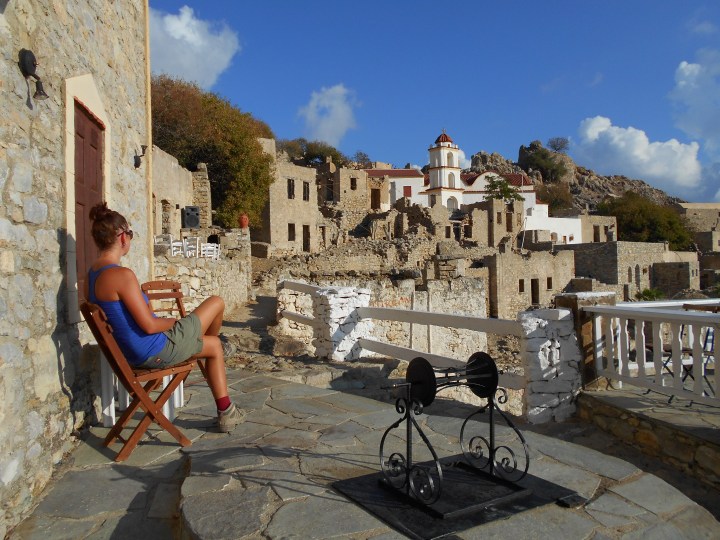 Bar zamknięty na cztery spusty, pusty dance floor, kable od głośników powiewają na wietrze, poskładane krzesła jeszcze mokre od porannej rosy…Opuszczona knajpa w opuszczonym mieście. Całkowita cisza, tylko patrzeć, jak spod stolików zaczną wyczołgiwać się duchy tych, co padli tu na placu boju (jak wiadomo, greckie ouzo potrafi powalić na kolana najlepszych zawodników). Siadam tuż przy barze, oddałabym wszystko za zimne piwo, ale nie mam złudzeń – nie doczekam się na barmana. Jestem w wiosce duchów – Mikro Chorio.