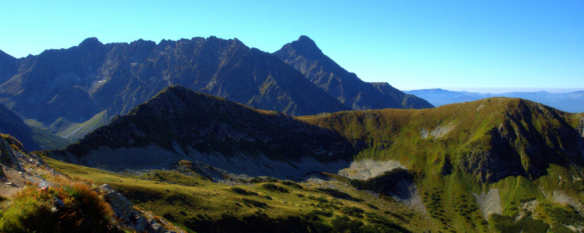 Na początku widokowego szału nie było, choć samo wędrowanie poza szlakiem i perspektywa oglądania zupełnie nowych widoków , nie widzianych wcześniej w necie tysiące razy,była dla mnie atrakcją. Ścieżka trawersowała zboczami Świnicy, a potem Walentkowego Wierchu.