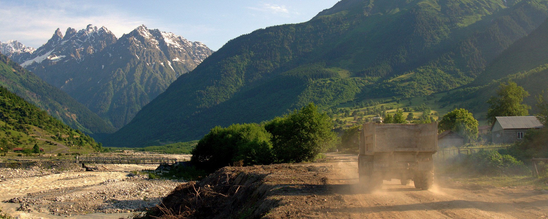 Startuję o 7 rano, bo boję się upału, który wczoraj mało mnie nie zabił. Uwaga : 7 rano to zdecydowanie za późno, no ale człowiek uczy się na błędach. Żeby dojść na szlak prowadzący do lodowca, trzeba przejść przez ostatni duży, ładny most w Mestii i wzdłuż rzeki kierować się w stronę lotniska.
