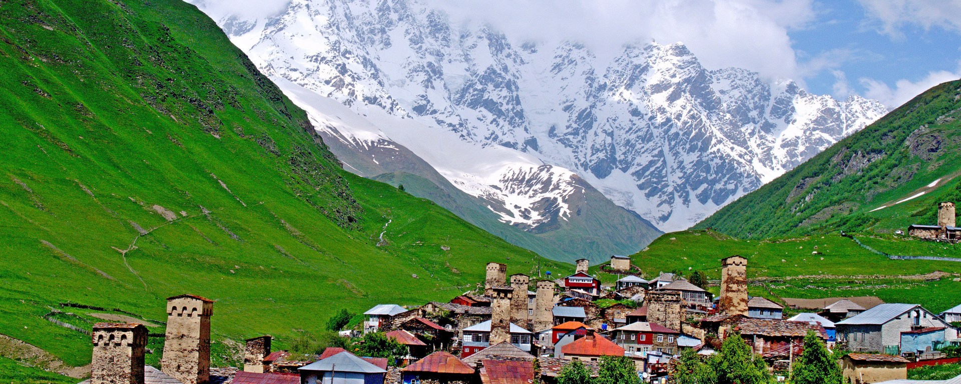 Wreszcie, po 2,5 godzinach telepania się Hondą z napędem na cztery koła, docieramy do zagubionego w górach raju. Wszystko jest dokładnie tak, jak sobie wybrażałam. Wieże stojące tu od kilkuset lat na tle muru Bezingi, bo tak nazywany jest masyw górski z najwyższą górą Gruzji – Szcharą. Królowa jest dziś dla mnie łaskawa, szczyty odsłaniają się, w ruch idą aparaty fotograficzne.